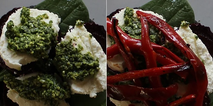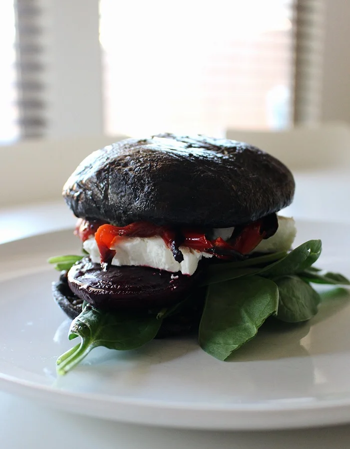 Para armar la hamburguesa coloca un hongo portobello sobre el plato, un puño de espinacas crudas, tres rodajas de betabel, queso de cabra (la cantidad que quieras, a mi me encanta así que le pongo bastante) pesto (también al gusto), pimientos, aguacate y tapa con otro hongo. ¡Disfruta!
