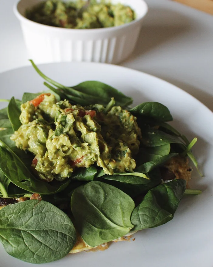 Aguacate machacado, kale, cebollín y jitomate picados, jugo de un limón, pimienta, pimienta de cayenne y un poquito de sal. ¡Ya está!