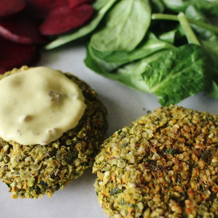 Precalienta el horno a 180°C (360°F), engrasa una charola (yo usé aceite de coco en aerosol) y alinea las bolitas aplastadas dejando espacio entre sí, hornea por 15 minutos y voltea, hornea por otros 15 minutos o hasta que estén doraditas. Acompaña con lo que quieras, puedes servirlas como hamburguesas o solitas, yo les puse aderezo de mayonesa con mostaza que mezcle con sobrante de salsa de chile de árbol molido con aceite de oliva y les quedó perfecto ;)